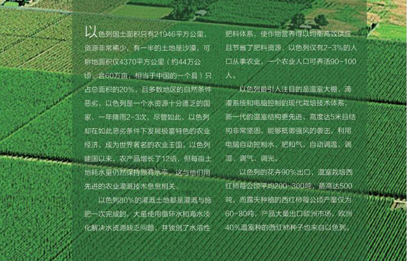 以色列国土面积只有21946平方公里,资源非常稀少,有一半的土地是沙漠,可耕地面积仅4370平方公里,(约44万公顷,合60万亩,相当于中国的一个县)只占总面积的20%,且多数地区的自然条件恶劣,以色列是一个水资源十分匮乏的国家,一年降雨2-3次,尽管如此,以色列却在如此条件下发展极富特色的农业经济,成为世界著名的农业王国。以色列建国以来,农产品增长了12倍,但每亩土地耗水量任保持原有水平,这与他们用先进的农业灌溉技术息息相关。