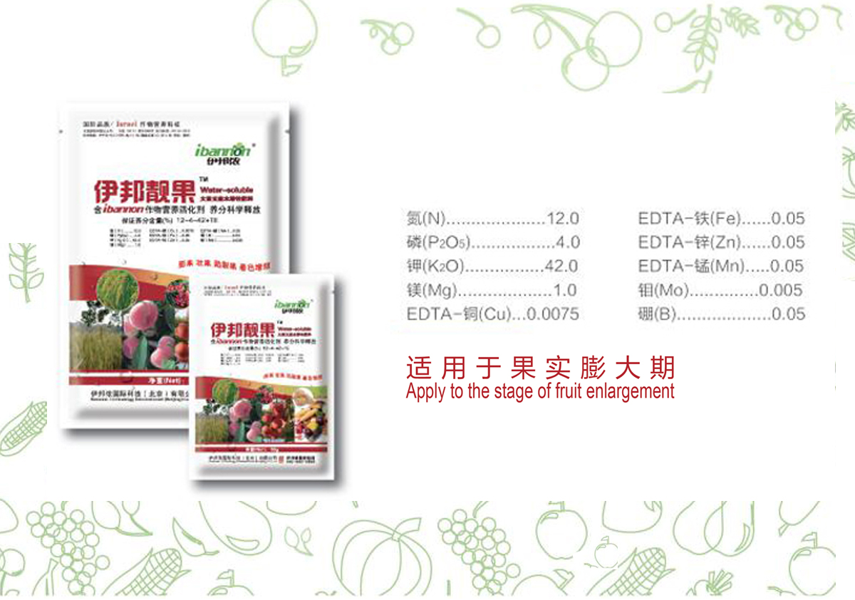 1.“伊邦靓果”大量元素水溶肥配方源于国际高端进口产品,是经过严格的田间作物试验而研发的科学配方,该配方符合作物在不同生长期的需肥规律,功效专一,能顺利实现作物生长阶段器官的建成,养分及能量转化等目标,最终达到在作物有限生长期获得更高的品质、更高产量的目的。