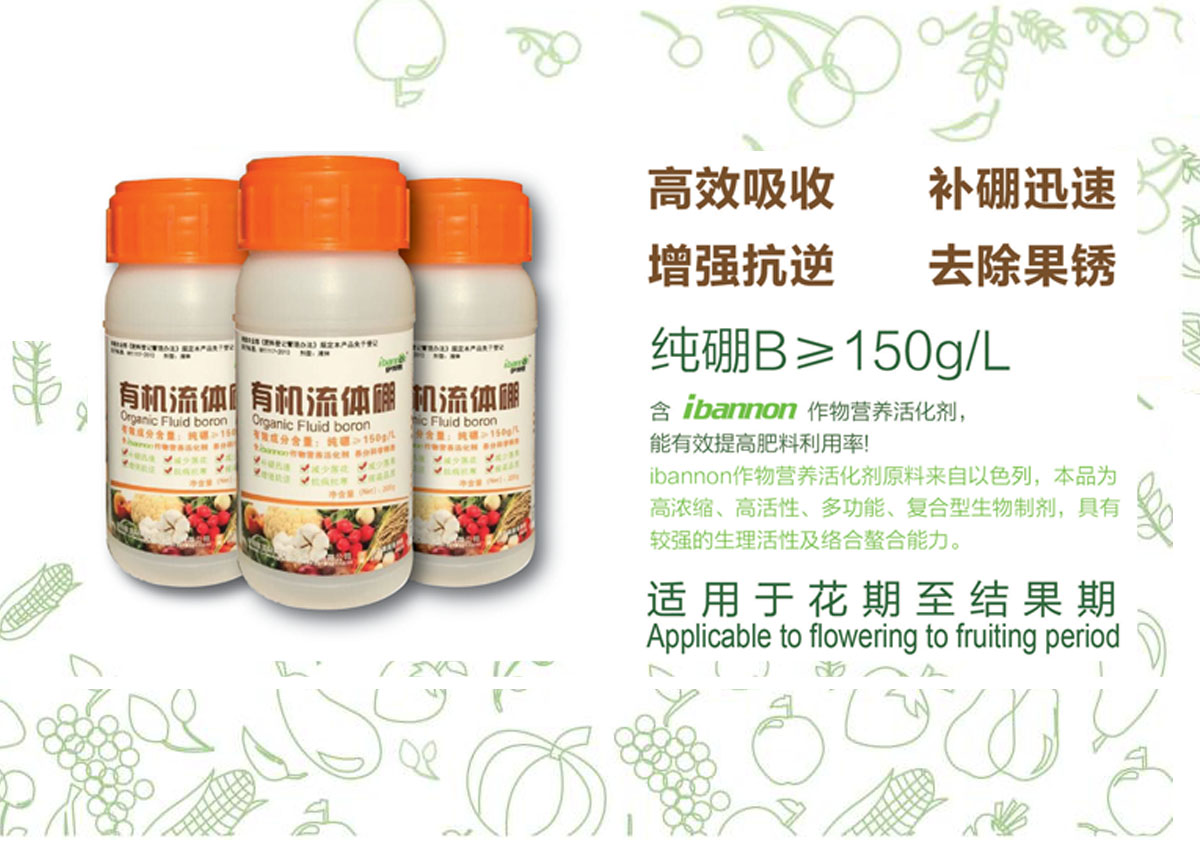 1. 有机流体硼是新一代螯合态液体硼肥,伊邦侬有机流体硼含量高达150g/L;